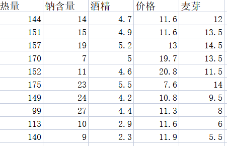 有10種500毫升啤酒的成分和價格等數(shù)據(jù),試用變量聚類對變量進行聚類以達到縮減變量的目的,篩選出預(yù)測變量。數(shù)據(jù)的變量包括熱量、鈉含量、酒精含量、價格、麥芽濃度。