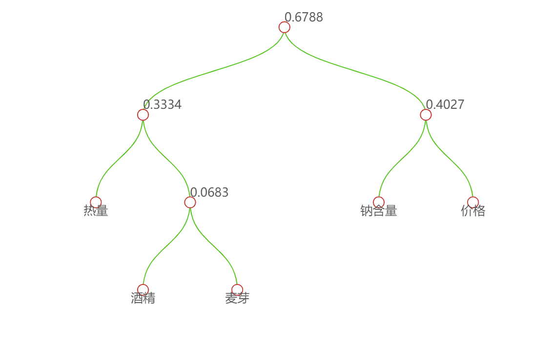 從結(jié)果樹狀圖中可以看出酒精含量與麥芽濃度兩個變量距離為0.0683,二者之間相關(guān)系數(shù)最大(相關(guān)系數(shù)等于1 - 距離)選其一即可,沒有必要都作為預(yù)測變量,導(dǎo)致成本增加。至于酒精含量和麥芽濃度選擇哪一個作為典型指標來代替原來的兩個變量,可以根據(jù)專業(yè)知識或測定的難易程度決定。(與因子分析不同,是完全踢掉其中一個變量以達到降維的目的。)這里選用酒精含量,至此,確定出用于預(yù)測的變量為:酒精含量,鈉含量,熱量,價格。