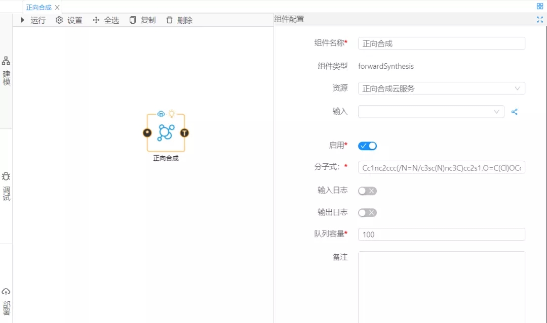 然后,進(jìn)行組件配置。資源項(xiàng)選擇正向合成云服務(wù),分子式填入?yún)⑴c反應(yīng)的相關(guān)反應(yīng)的SMILES表達(dá)式,并按照相應(yīng)規(guī)則填入,如圖2所示。最后點(diǎn)擊調(diào)試,當(dāng)顯示運(yùn)行成功時(shí)即表示運(yùn)行預(yù)測算法成功,平臺會將預(yù)測結(jié)果展現(xiàn)給用戶,結(jié)果如圖3所示。