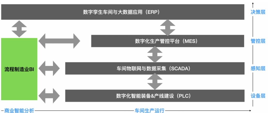 盡管流程制造業(yè)在自動化向數(shù)字化、智能化轉(zhuǎn)型過程中使用的系統(tǒng)或技術(shù)不斷更新迭代,但其與BI在數(shù)據(jù)存儲、處理、分析、可視化及預(yù)測上的融合并不明顯,圍繞生產(chǎn)過程使用的各個系統(tǒng)(如:PLC、SCADA、MES等)和標準化的數(shù)據(jù)應(yīng)用產(chǎn)品(如:數(shù)據(jù)庫、ETL等)在面向流程制造業(yè)的使用過程中存在以下問題: