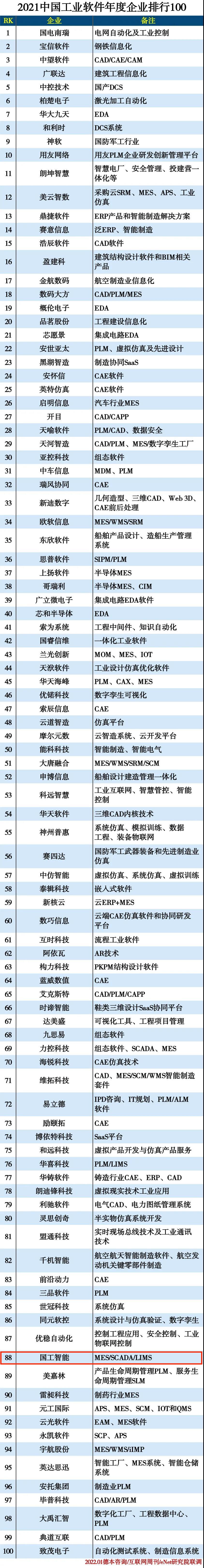 1月10日,《互聯網周刊》聯合eNET研究院、德本咨詢發布了“2021中國工業軟件年度企業排行100”排行,國工智能位列第88名!