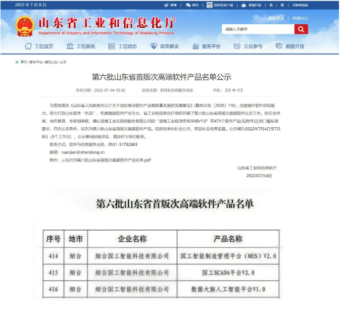 7月4日,山東省工信廳公示了第六批山東省首版次高端軟件產(chǎn)品名單,煙臺國工智能科技有限公司自主研發(fā)的“數(shù)據(jù)大腦人工智能平臺V1.0”、“國工智能制造管理平臺(MES)V2.0”、“國工SCADA平臺V2.0”三款軟件產(chǎn)品同時(shí)成功入選,是煙臺市獲批數(shù)量最多的專業(yè)軟件企業(yè)。