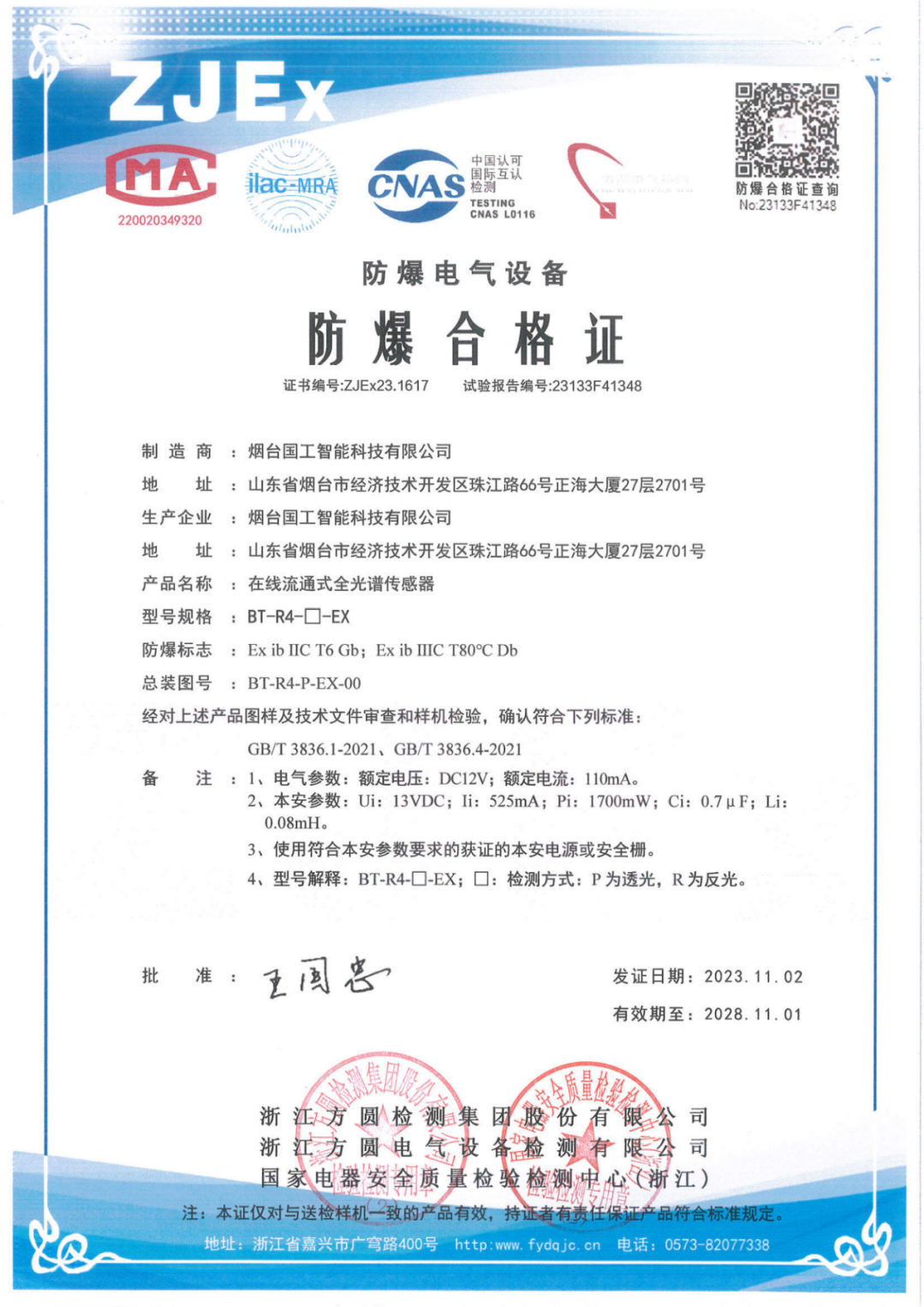 近日,國工智能的全光譜傳感器系列產品:“在線流通式全光譜傳感器”,“在線通用型全光譜傳感器”拿下“本安型防爆合格證。