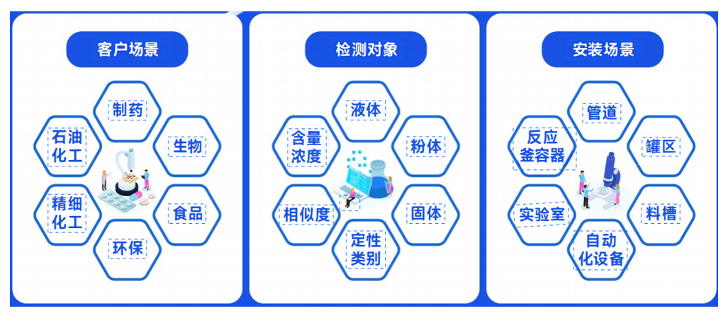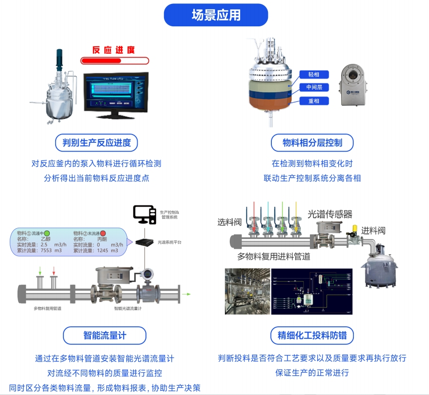 通用型在線光譜儀專門為化工場景所研發,采用本安型防爆傳感器,多光源、大光程,抗干擾能力強,能夠快速的檢測分析得出結果,保證生產現場管理時效性。采用夾持的方式安裝在管道視鏡上,安裝調試方便,采樣覆蓋紫外-可視光-紅外全頻段。無需更換傳感器來調整頻段,可與產線生產控制系統如DCS進行聯動和數據傳輸,同時整套系統接入國工智能MAI系統,對產線產品生產進行實時監控和決策分析.
