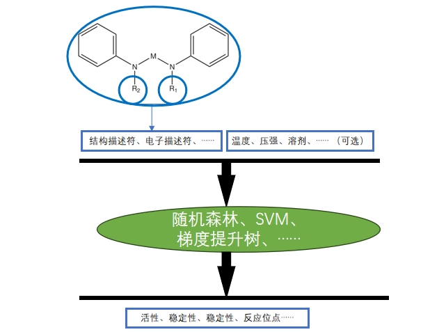 性能預測器基于先前的實驗和文獻數據,用于預測新催化劑的性能。首先,計算催化劑的結構描述符和電子描述符。結構描述符包括埋藏體積、特定鍵長和鍵角、分子體積以及表面積等。電子結構描述符則包括福井函數、電子密度和軌道能量等指標。為了滿足計算精度和速度的需求,采用不同級別的結構優化方法,如力場、半經驗和密度泛函理論(DFT)。接下來,建立描述符和催化劑性質之間的機器學習模型。選擇適當的特征和機器學習模型的超參數,并在必要時考慮實驗條件與描述符的關聯。然后,利用機器學習模型篩選出符合要求的新分子。這種將機器學習與計算化學相結合的方法極大地縮小了實驗篩選的范圍,從而加快了分子發現的進程。